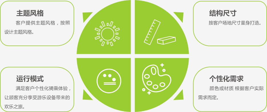 龍之盈不僅能設(shè)計制造標(biāo)準(zhǔn)型游樂設(shè)備,也能提供個性化設(shè)備的設(shè)計方案及制造產(chǎn)品以滿足客戶多樣化主題產(chǎn)品需求。為此,龍之盈游樂特設(shè)定制服務(wù),明確客戶需求并制定出解決方案,從產(chǎn)品的設(shè)計制造到安裝運(yùn)營,最大限度的滿足客戶需求。