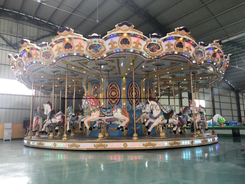 旋轉木馬相信大家都見到過,在大型超市、廣場、公園、廟會等,旋轉木馬可以說是每個娛樂場地標志性的游樂設備了,它可以說是見證了游樂設備行業的發展。雖然說經營轉馬的商家數量有很多,但是還是有很多投資者想要經營它,因為它收益快、投資小、也好管理,可移動性強,拆卸安裝兩三個小時就可以了。隨著人們生活條件提高,對旋轉木馬的要求也越來越同,市場上偶爾也會出現很豪華的旋轉木馬,那豪華旋轉木馬和簡易轉馬有什么區別呢?