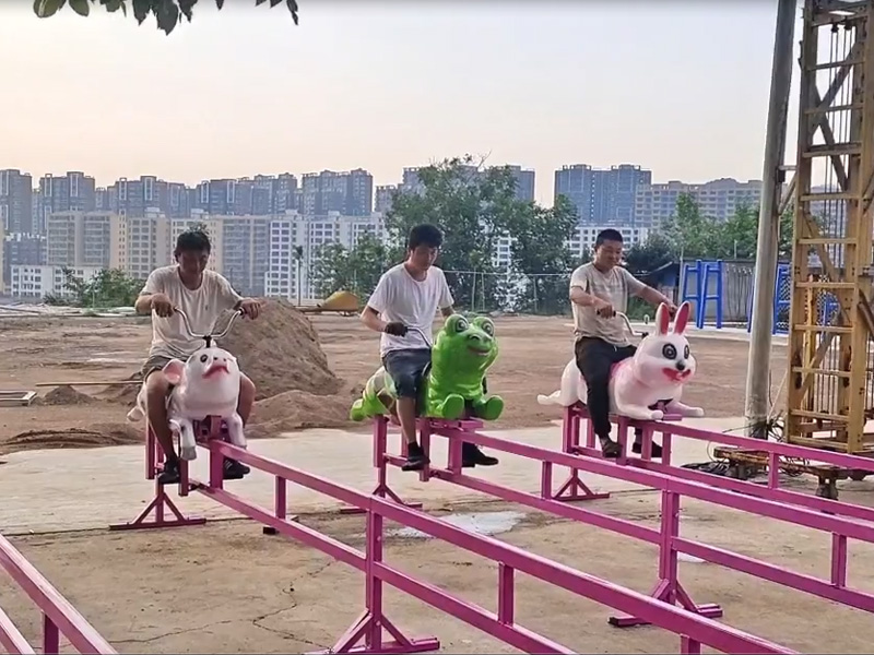 乘客騎坐在形態(tài)各異的小豬座艙上,用手中的搖桿帶動輪子在軌道上前進(jìn)或后退,想要跑得快還是需要一定的技巧,朋友之間可以來一場歡樂的友誼賽,很是有趣。